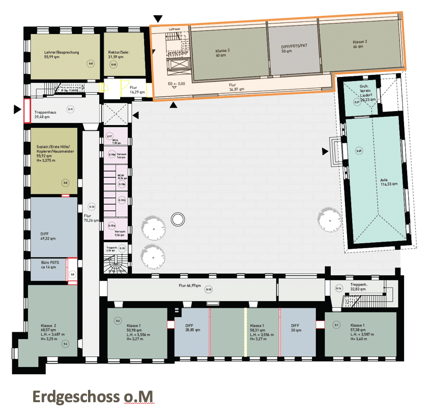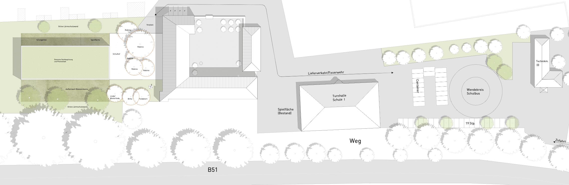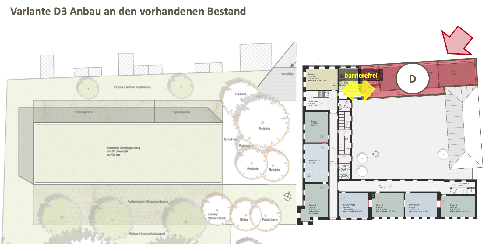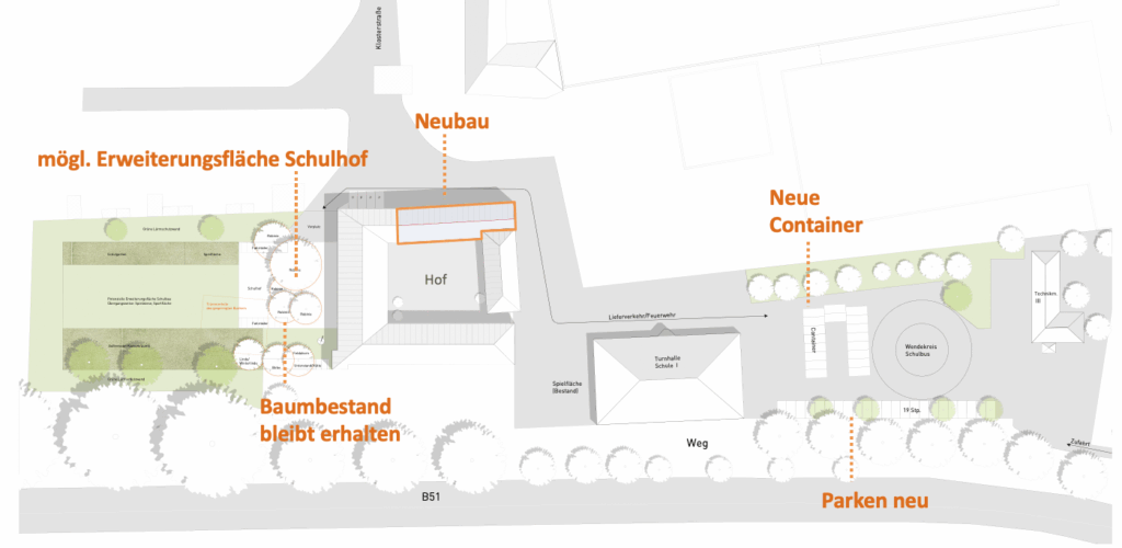 In der Klosterschule in Saarlouis-Fraulautern stehen durch die in den letzten Jahren gestiegene Anzahl an Schüler*innen, bei gleichzeitig steigender Nachfrage nach einer Ganztagsbetreuung, nicht genügend Räume im Bestandsgebäude zur Verfügung.