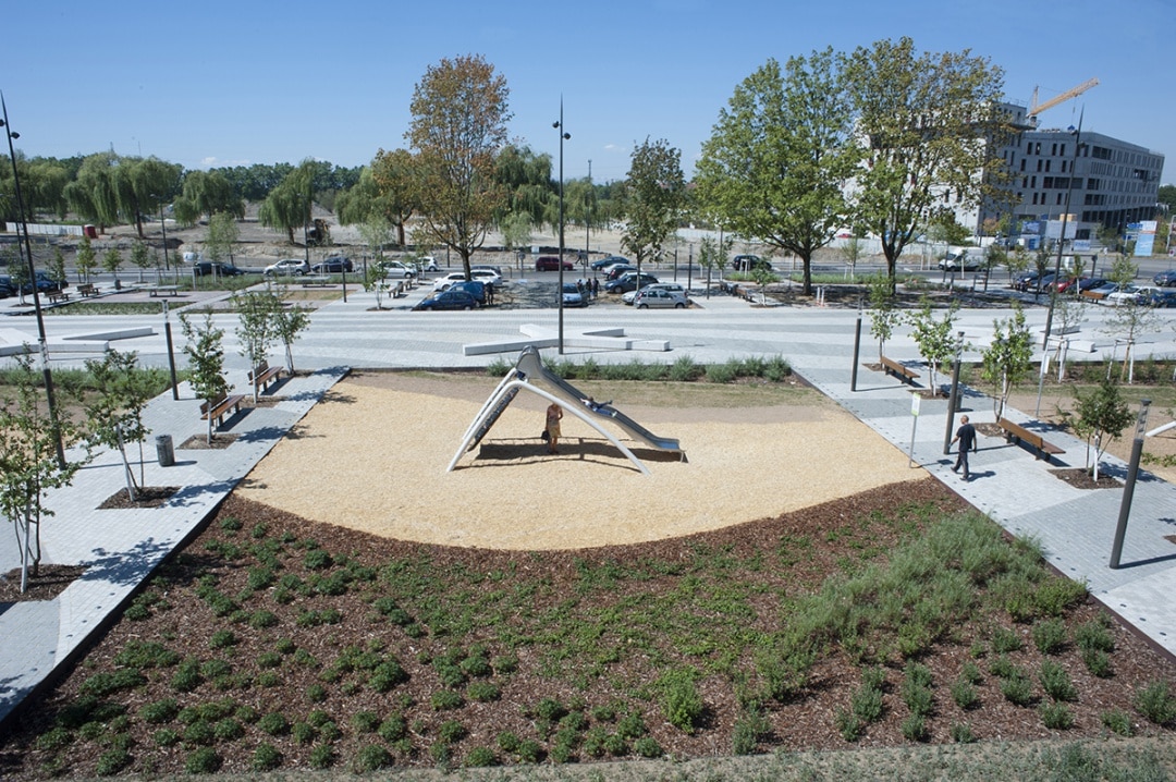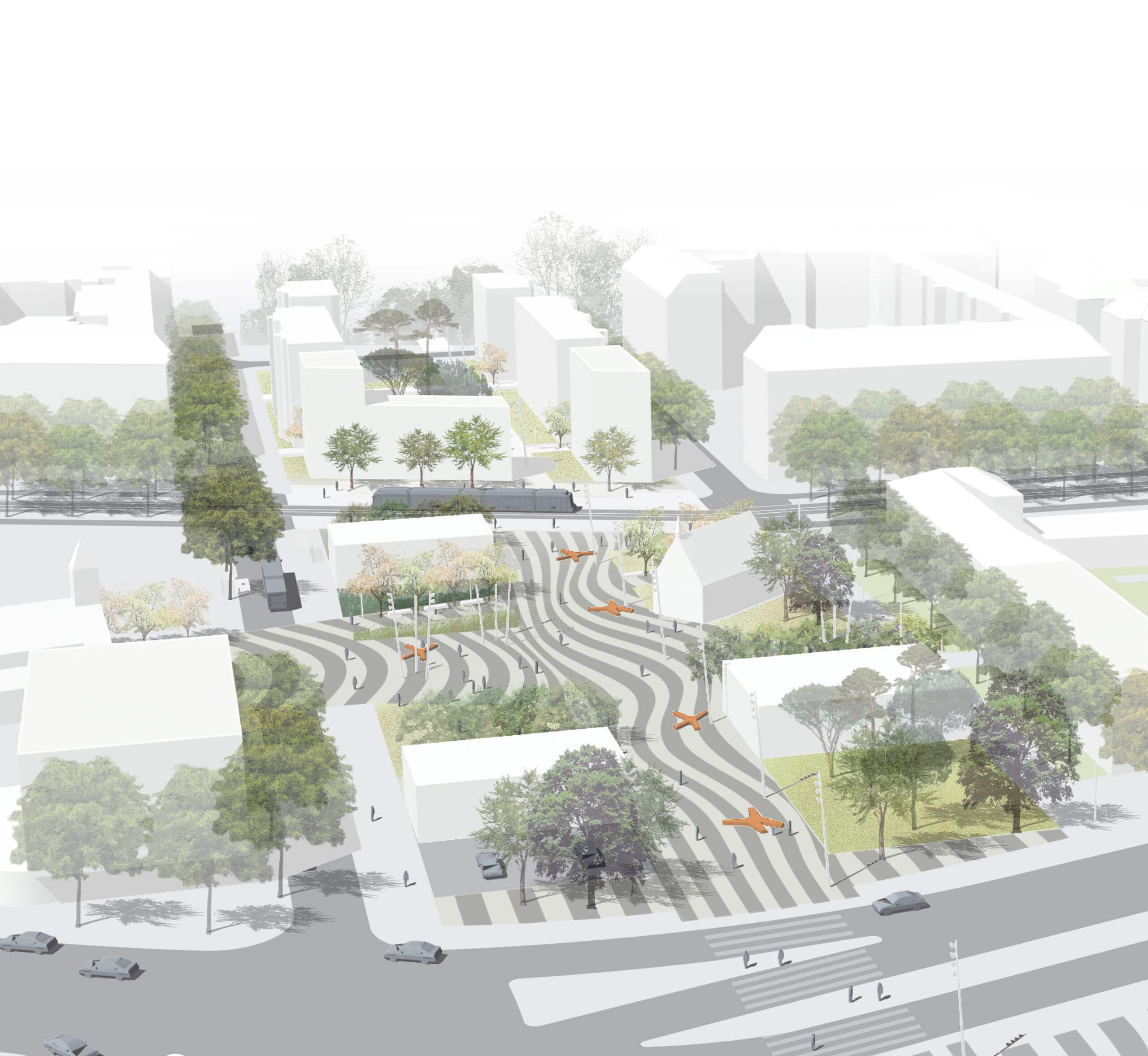 Dieser Archipel wird nun durch ein Netzwerk aus grünen Passagen neu erschlossen, eine Straßenbahnlinie verbindet die Ufer, an ihren Haltestellen ergeben sich nachhaltige öffentliche Räume, die eine wassersensible Stadtplanung mit aktiven Aufenthaltsbereichen abbilden und in ihrer Gestaltung die Geschichte des Ortes neu interpretieren.